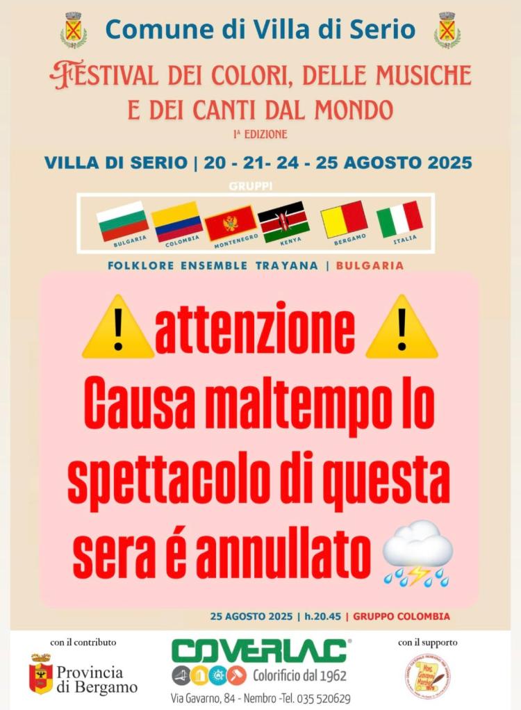A causa delle pessime previsione meteorologiche lo spettacolo folcloristico previsto per questa ser a (mercoledì 20 agosto) nel cortile della Biblioteca nell'ambito del 1° Festival dei colori, delle musiche e dei canti dal mondo è annullato.